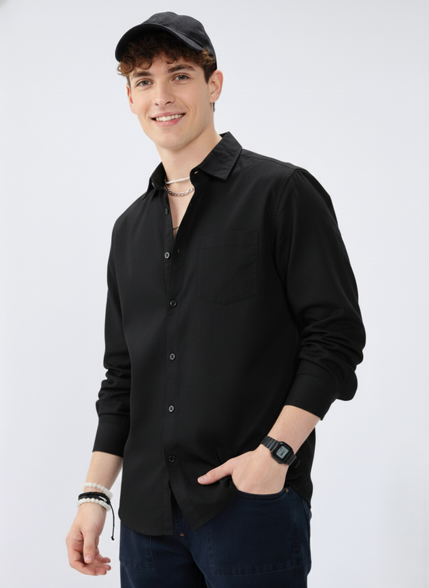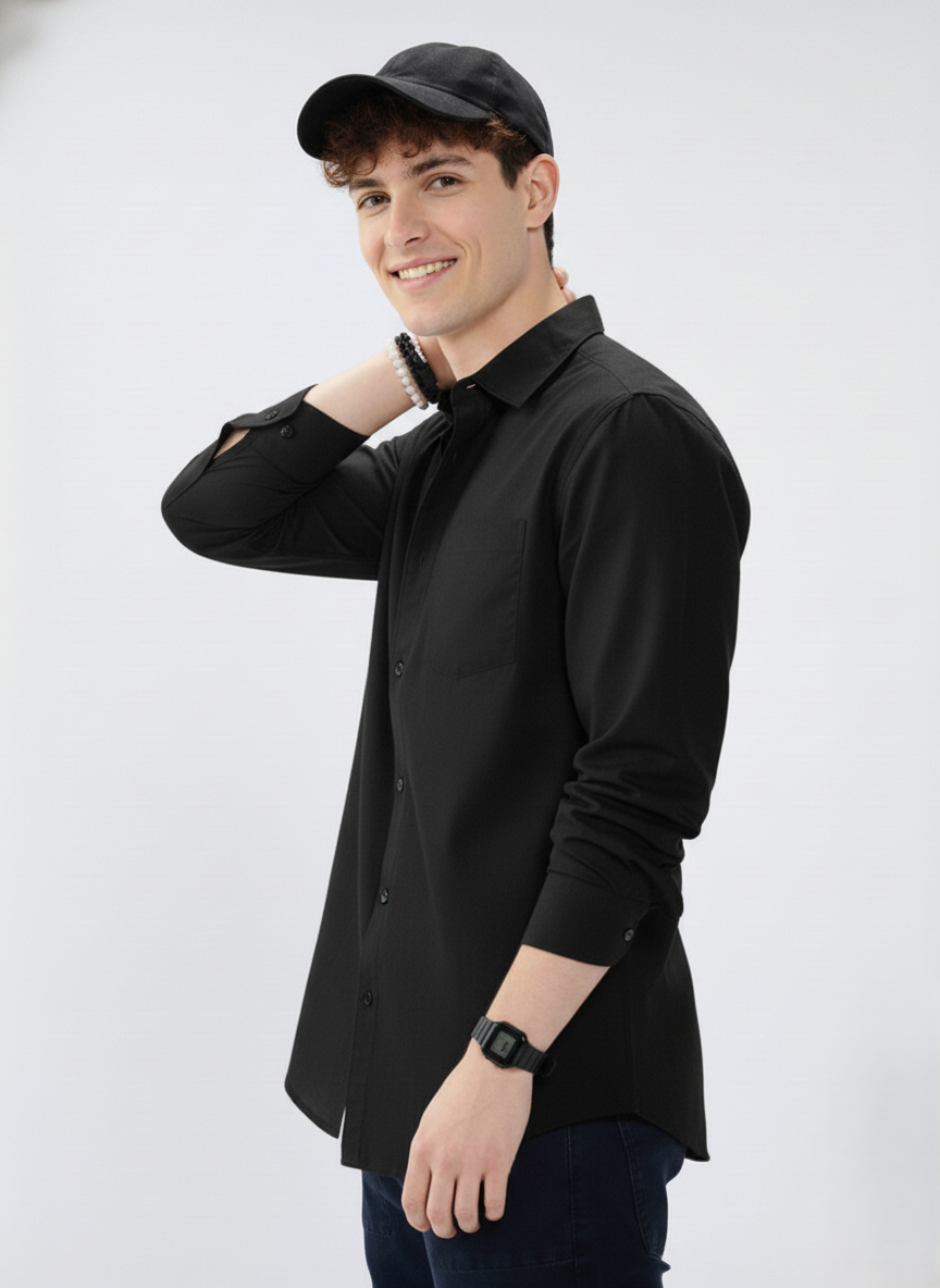 Crafted from 100% premium cotton, it ensures breathability, softness, and all-day comfort. The shirt features a clean solid black design, full sleeves, and a button-down front, making it perfect for both formal occasions and smart-casual outings. Whether you’re heading to the office, a dinner date, or a night out, this versatile shirt complements every mood and occasion.